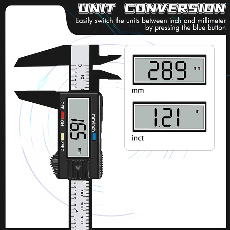 Get accurate and reliable measurements every time with the 150mm Digital Vernier Caliper. Designed with a lightweight carbon fiber body and a protective plastic case, this digital caliper is perfect for professionals, engineers, students, and DIY enthusiasts. The large LCD display ensures easy reading, while the metric/inch conversion makes it versatile for multiple applications. Ideal for measuring internal, external, depth, and step dimensions with precision.