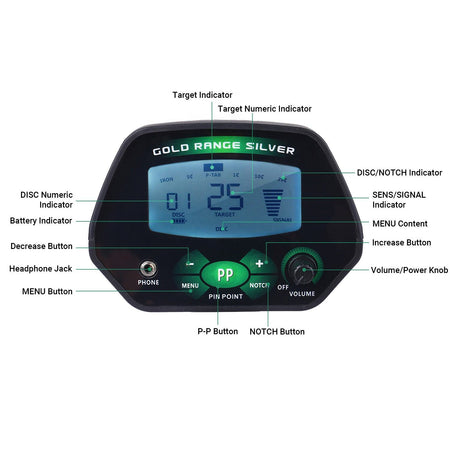 The high-contrast LCD screen displays target ID, sensitivity levels, discrimination settings, and signal strength for easy and intuitive use. Use the Pinpoint (PP) mode to accurately locate the target’s exact position before digging.