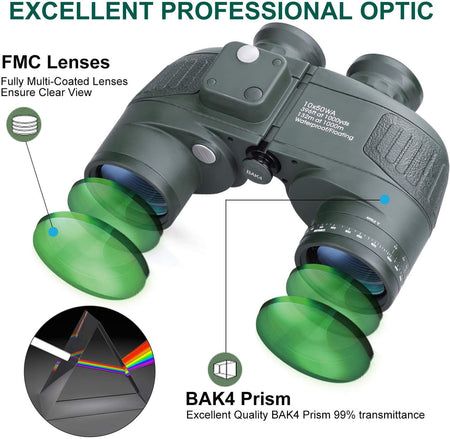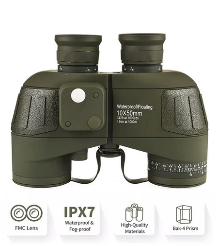 Equipped with a built-in illuminated compass and rangefinder reticle, this binocular allows accurate navigation and distance measurement, even in challenging conditions. Its rugged, rubber-armored construction ensures durability and shock resistance, while the waterproof, fog-proof, and floating design makes it perfect for military, marine, and outdoor use.